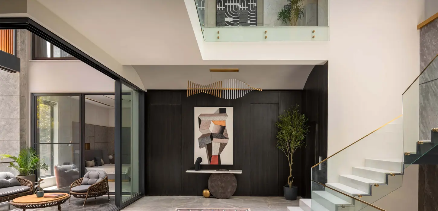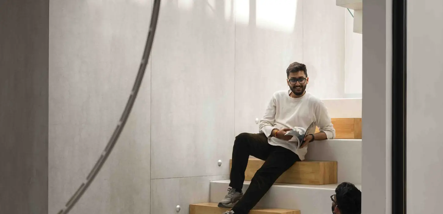 Nestled on a trapezium-shaped corner plot, Step Maze house is a tranquil haven for a family of five and their dog. The design maximizes light and breeze from the two street-facing sides, with louvers and jaalis providing shading and privacy. The home's vertical core features staggered staircases, creating dynamic, airy spaces. The layout includes an entrance lounge, parking, living areas, bedrooms, and a terrace with an open garden. Thoughtfully designed for energy efficiency, the house ensures a serene and sustainable environment.